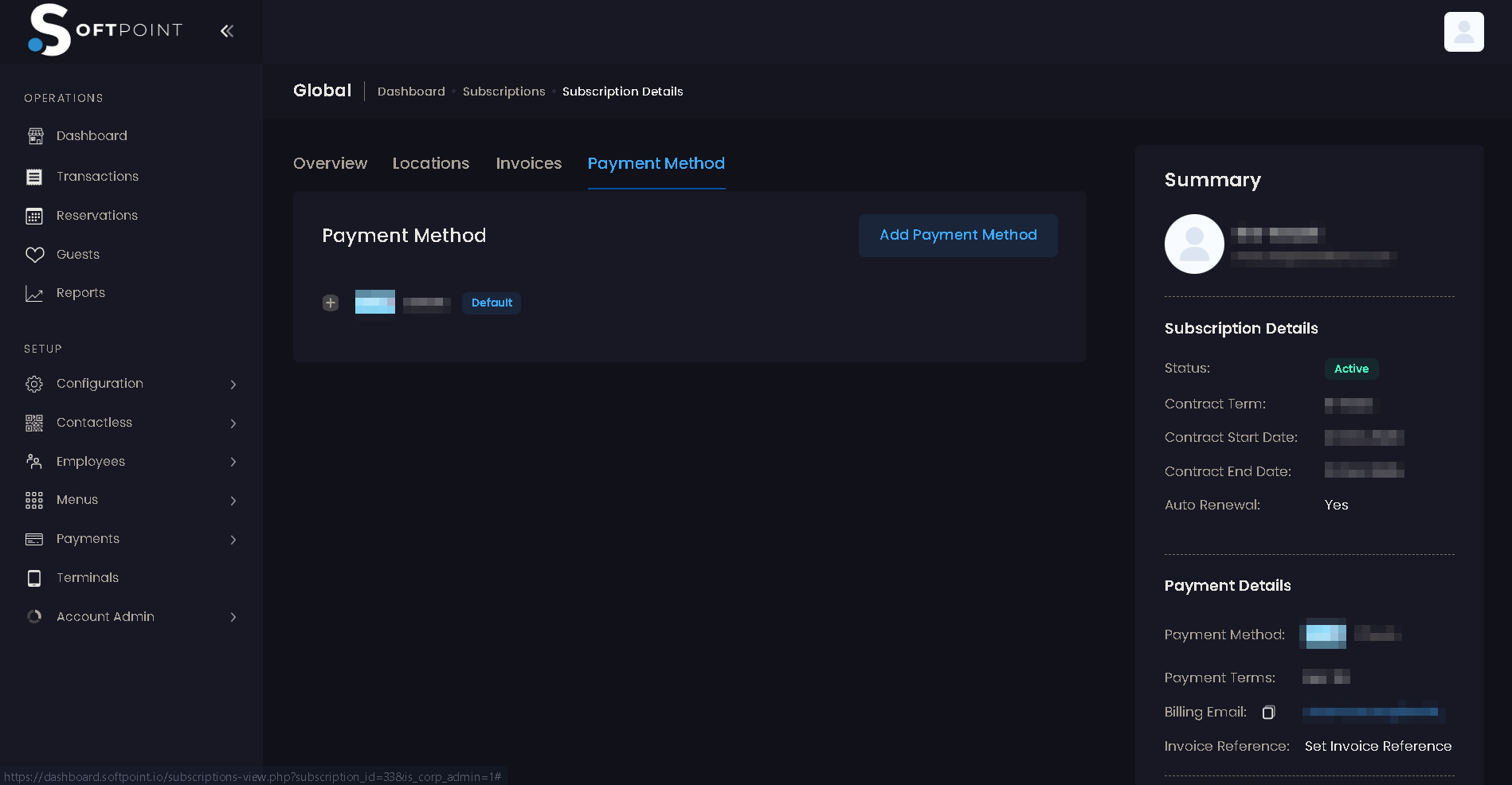 This section provides an overview of your subscription, including products, billing, and payment information. It is divided into four main tabs: Overview, Locations, Invoices, Payment Method