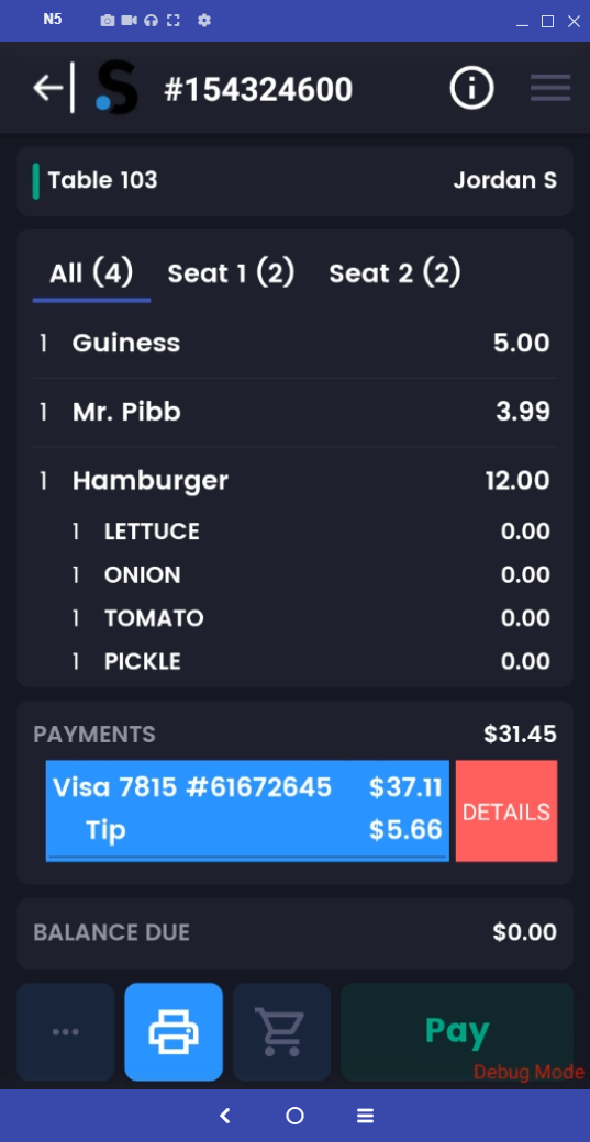- Discount – You can apply a discount from the device to the ticket. This can be done with the discounts that are currently setup on your POS system. The discount can be set to only be done with manager approval as well.