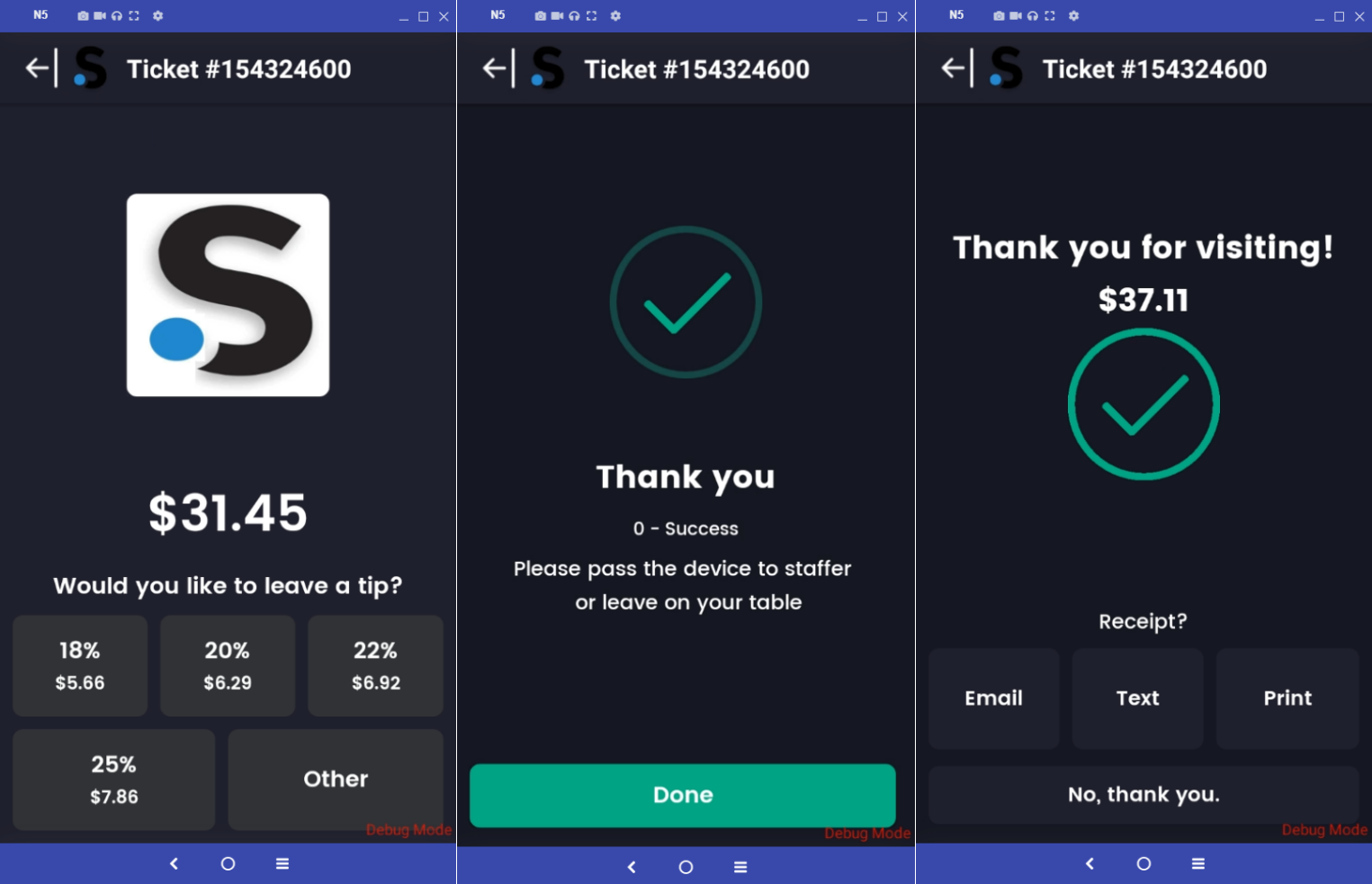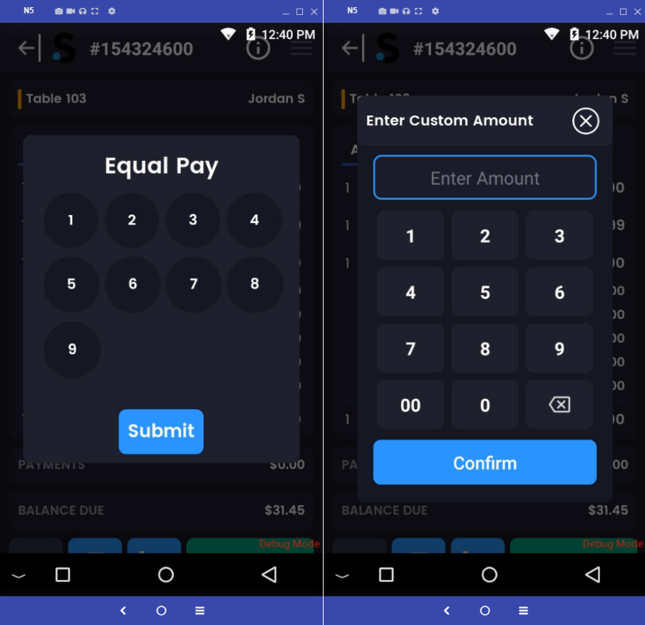 Equal Pay – This is splitting the check between the number of people you select. Each will select a tip, pay, then select a receipt before going to the next person.