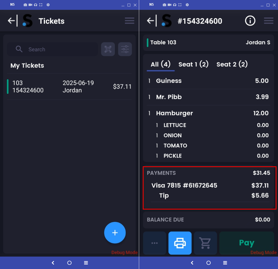 From there you can see the closed tickets for the date you are looking on. Once you select the ticket you will see the ticket details and you can see the card payment under the Payments section.