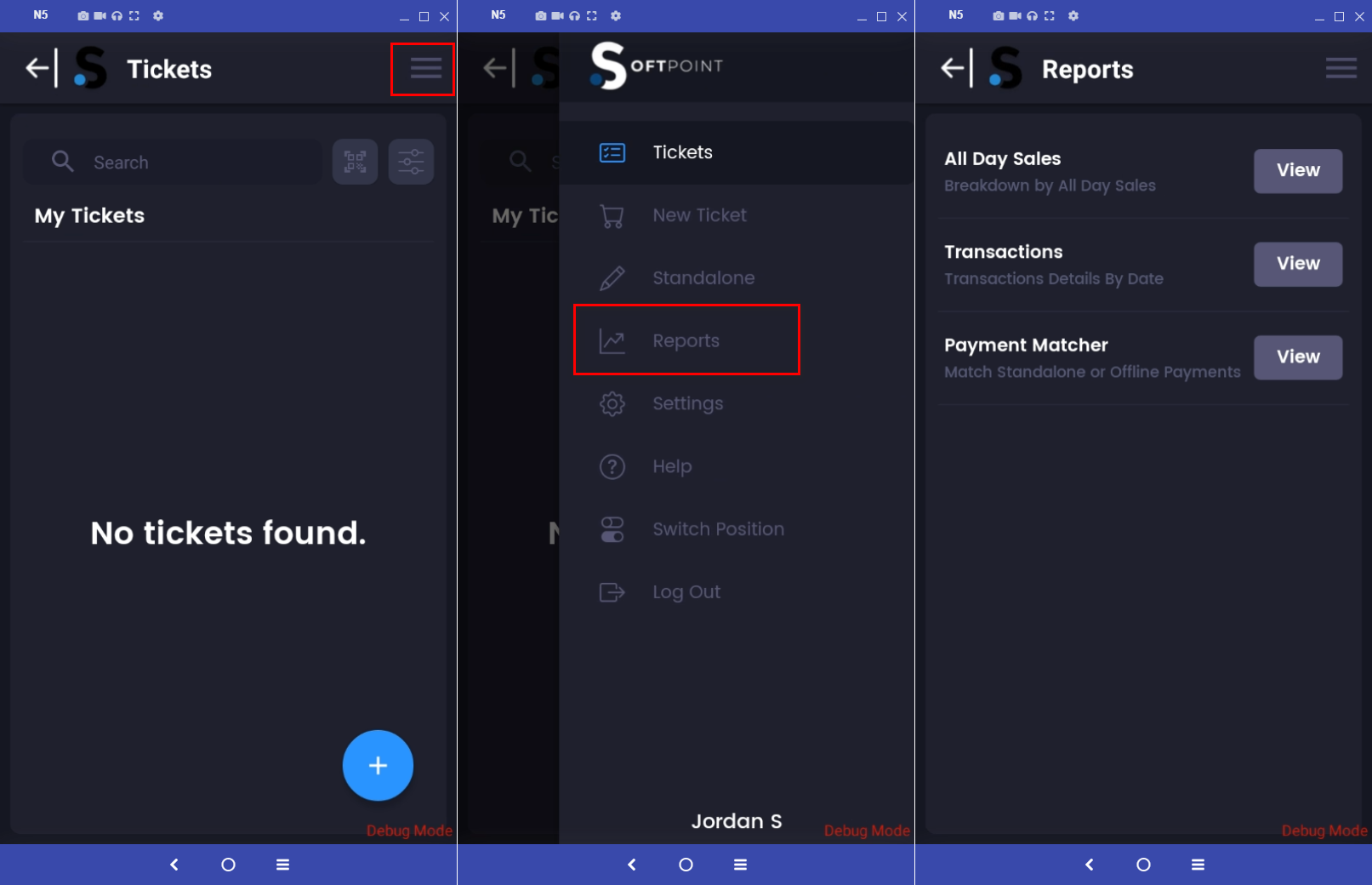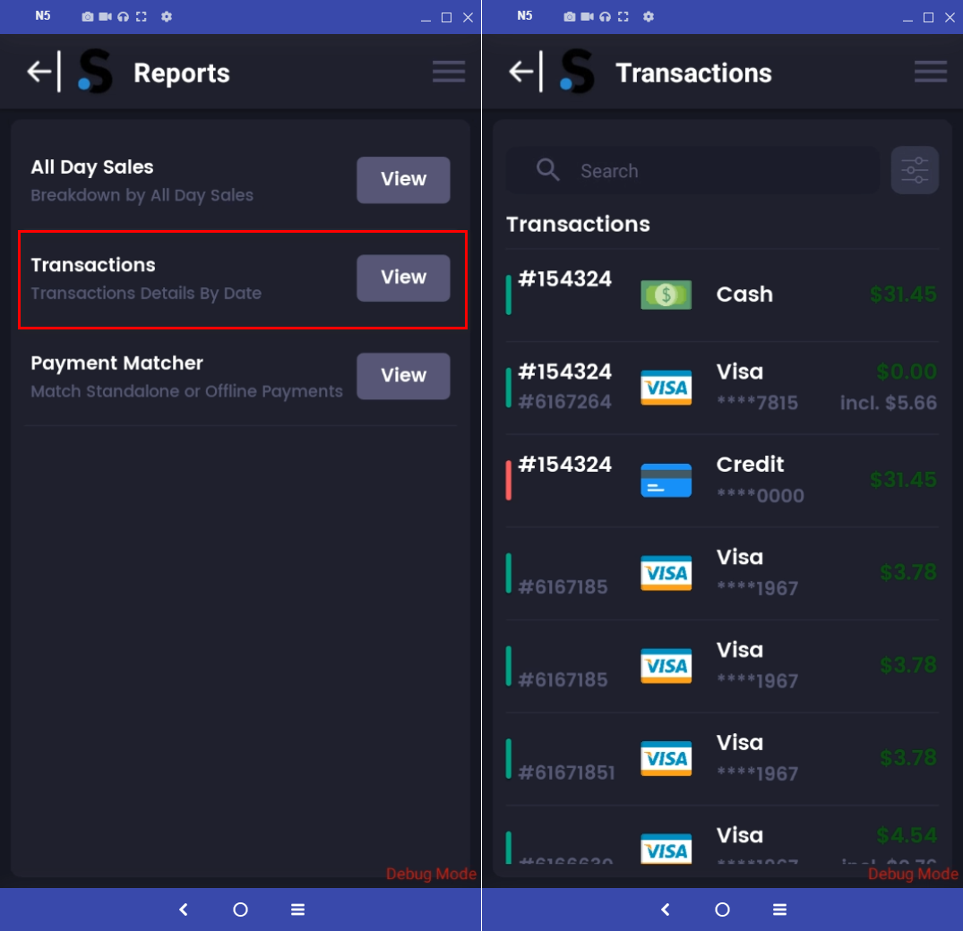 The additional way you can find a transaction is by selecting the three lines in the upper right-hand corner and going to reports.