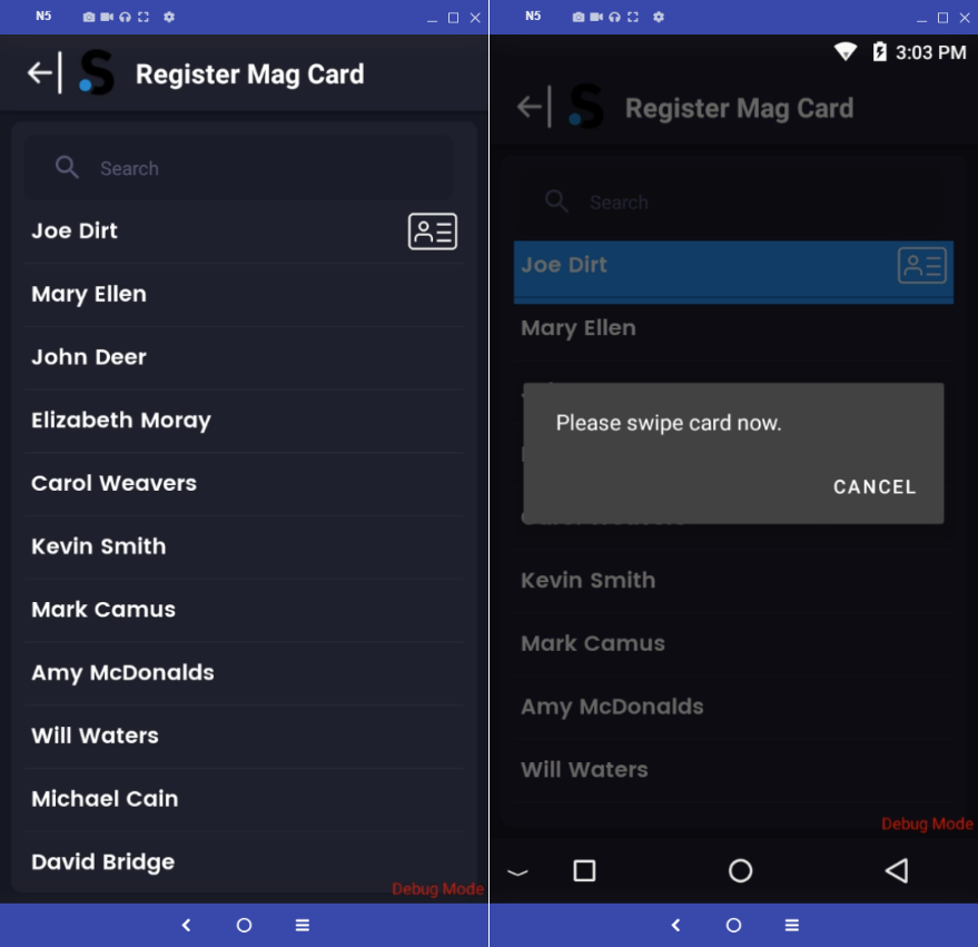 The option below POS Refresh is Register Mag Card. If you have the permission access, you can then go into here and select an employee to pair them with a mag card. Once paired, the employee will then swipe the mag card to login instead of putting in their pin number. You can also go in here to update any paired mag cards.