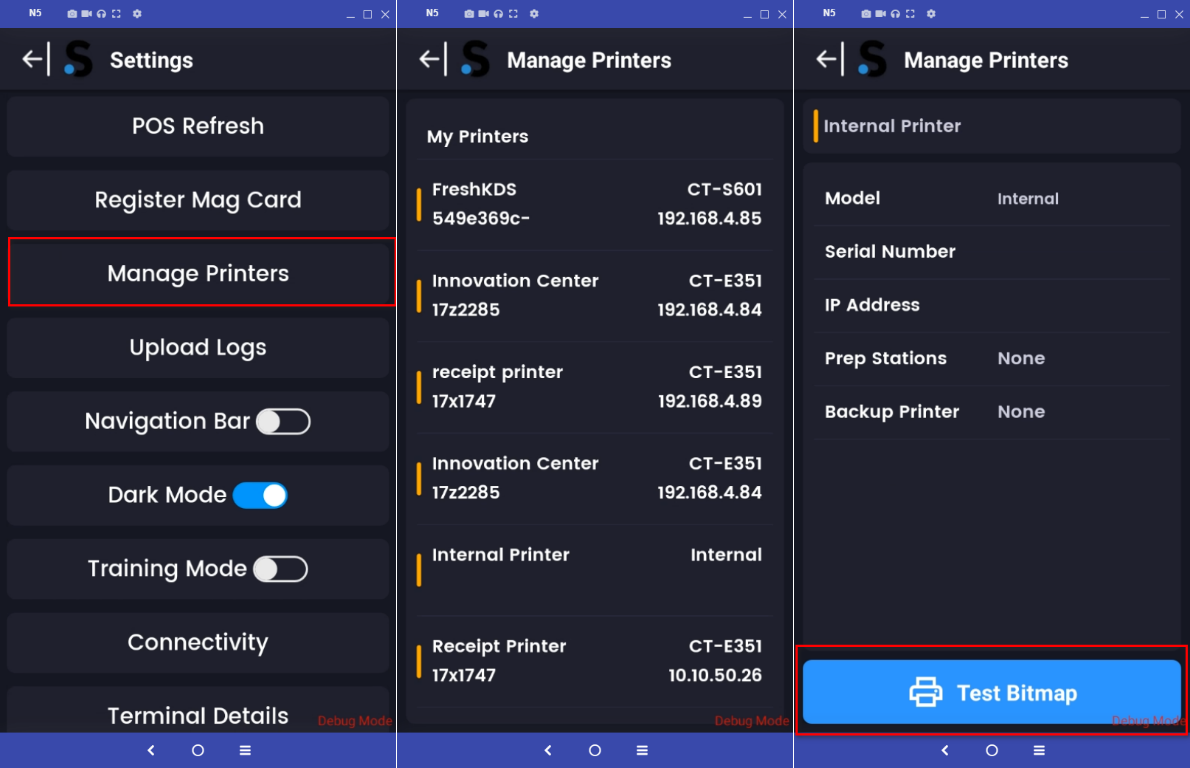 Under Register Mag Card is Manage Printers. In Manage Printers you can run a test print for any printers connected to your location as well as the built-in printer on any devices.