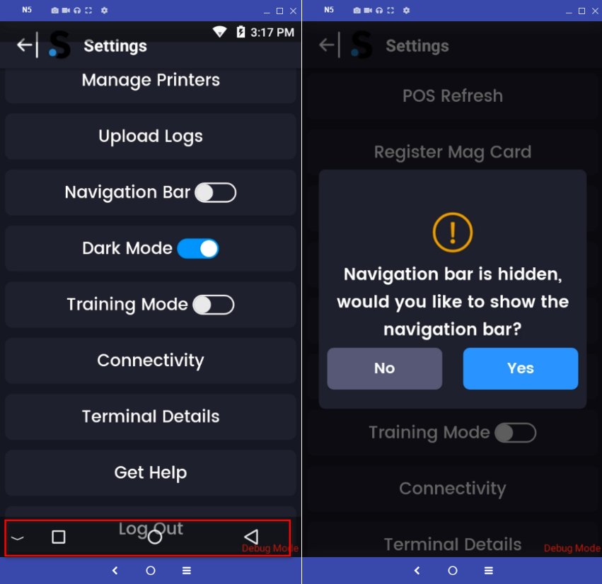 Navigation Bar – This option is about letting the user being able to jump out of the payment or SoftPoint application by selecting the home screen button. This is turned off by default and can be turned on by selecting the Navigation Bar.