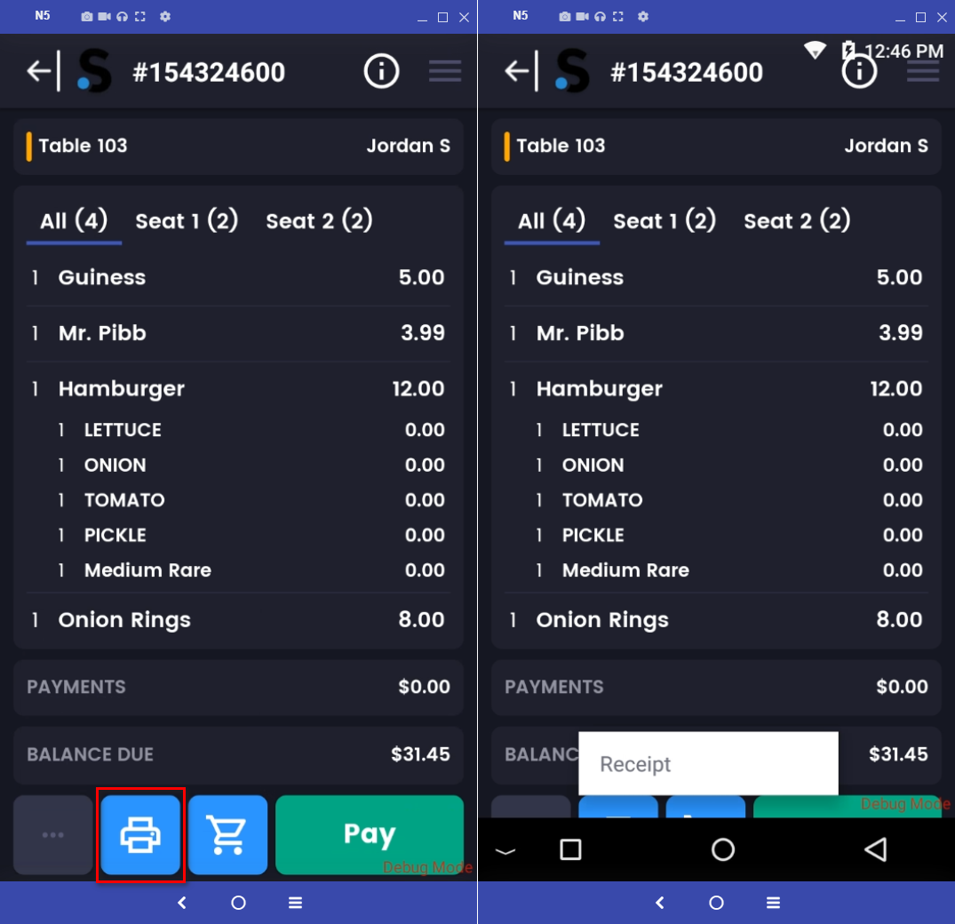 The next option next to the three dots in the lower left-hand corner, is the blue printer button. This allows you to print out the itemized receipt, or once there is a payment, you can reprint, email, or text the payment receipt.