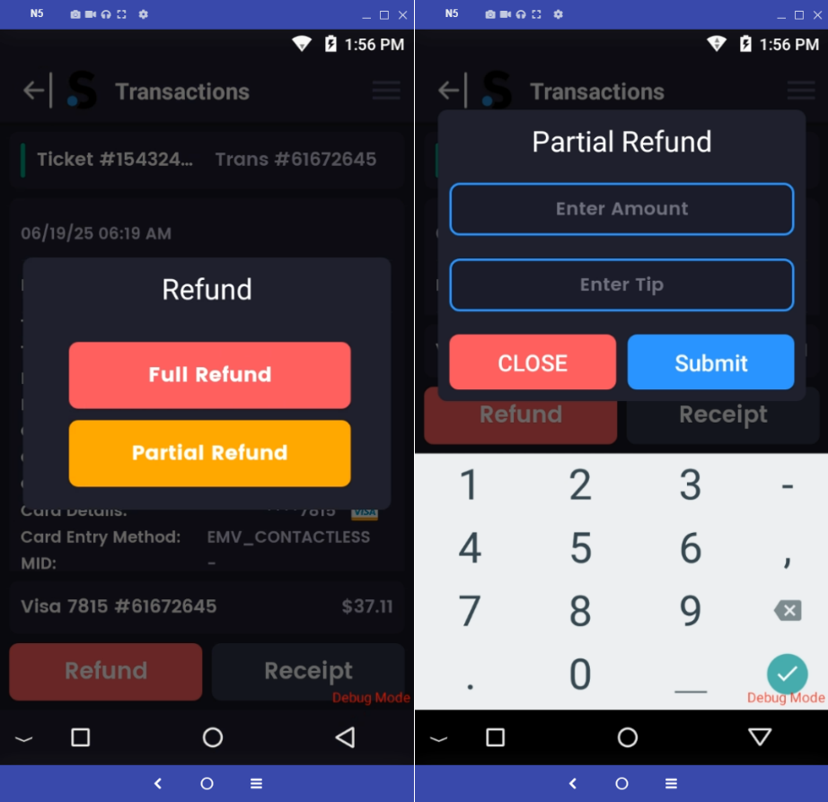In here you can see the details of the transaction including how the card was inserted, the last 4 of the card and the time the transaction was taken. At the bottom, you have two separate buttons, refund and receipt.