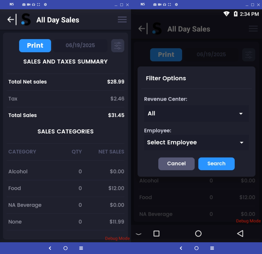 In the All Day Sales Report, you can see your own sales and tips for what you are doing throughout the day. If you are a manager, you can see the sales for the whole store. You can also print the All Day Sales report, select which day you want to look at, or choose to filter by Revenue Center or by Employee. (Filter by Employee only available to those who can see all current open tickets)