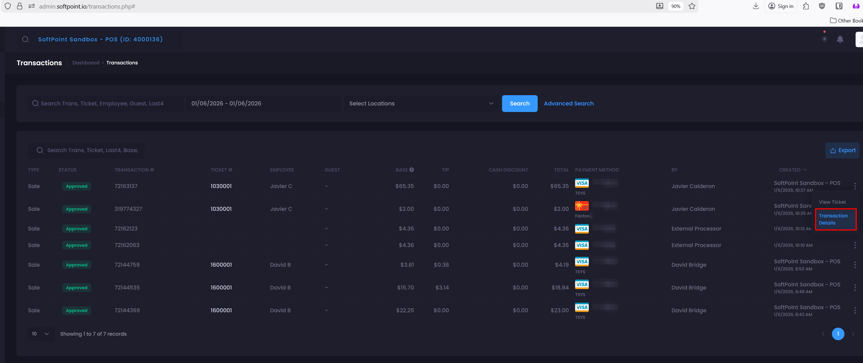 Once you're on the transaction list for a location in dashboard